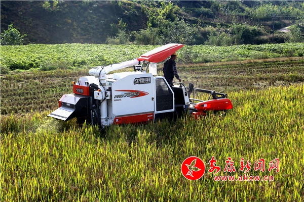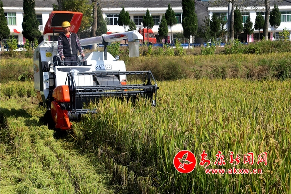 稻田里,收割機(jī)正在縱橫馳騁,所到之處稻穗被“大口吞進(jìn)”,金燦燦的谷粒歡快地蹦進(jìn)儲(chǔ)存艙里,伴隨收割機(jī)尾部吐出的碎末,秸稈瞬間被粉碎還田。