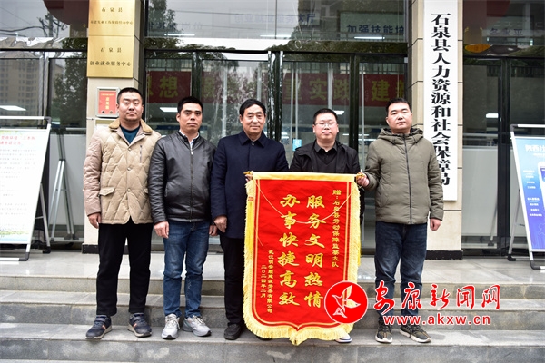 本網(wǎng)訊(通訊員 胡。2月18日,春節(jié)后上班第一天,武漢某勞務(wù)公司負(fù)責(zé)人及工人代表專程趕到石泉縣,將一面印有“服務(wù)文明熱情 辦事快捷高效”的錦旗送到該縣人社局勞動(dòng)保障監(jiān)察大隊(duì),對(duì)工作人員為民維權(quán)、積極保障勞動(dòng)者權(quán)益的辛勤付出表示由衷的感謝和敬意。