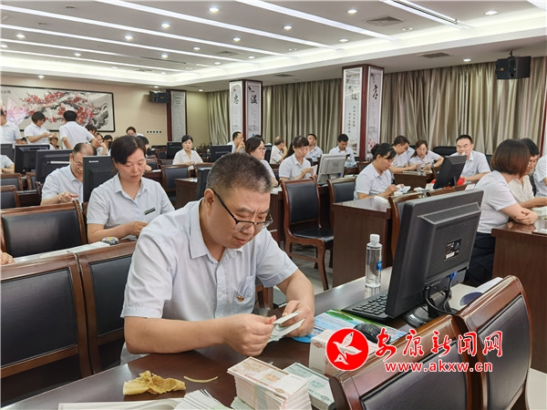 據(jù)了解,此次比賽設(shè)置了翻打百?gòu)垈髌薄⒆址浫牒褪止c(diǎn)鈔、業(yè)務(wù)知識(shí)競(jìng)賽四個(gè)項(xiàng)目。在翻打百?gòu)垈髌焙蜐h字錄入環(huán)節(jié),選手們靈巧的雙手在計(jì)算器和鍵盤上游走,伴隨著“噼里啪啦”敲擊聲,只見一個(gè)個(gè)數(shù)字答案輸入考試系統(tǒng),一行行字符在電腦屏幕上快速跳動(dòng)。在點(diǎn)鈔比賽中,選手們單指單張、多指多張等多種點(diǎn)鈔手法各顯風(fēng)采,清點(diǎn)、墩齊、扎把、蓋章,每個(gè)步驟都環(huán)環(huán)相扣,一絲不茍,嫻熟的手法讓人目不暇接,印象深刻。