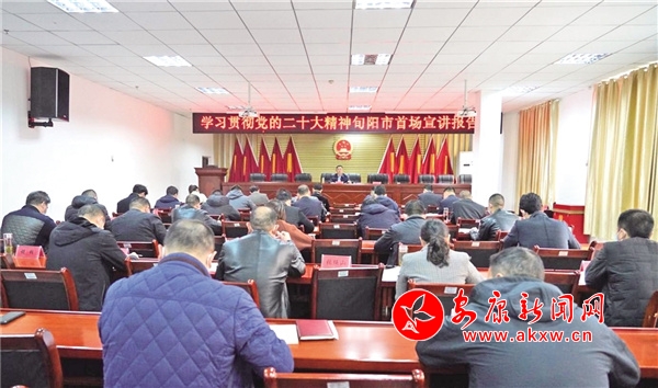 黨的二十大為新時(shí)代新征程黨和國(guó)家事業(yè)發(fā)展、實(shí)現(xiàn)第二個(gè)百年奮斗目標(biāo)擘畫了發(fā)展藍(lán)圖、規(guī)劃了實(shí)踐路徑、作出了戰(zhàn)略部署。旬陽(yáng)市委第一時(shí)間召開會(huì)議、印發(fā)通知,要求全市各級(jí)黨組織和廣大黨員把學(xué)習(xí)宣傳貫徹黨的二十大精神作為當(dāng)前和今后一個(gè)時(shí)期的重大政治任務(wù),迅速興起學(xué)習(xí)熱潮。去年10月24日以來(lái),市委先后召開6次會(huì)議集中學(xué)習(xí)黨的二十大精神,10月28日,全市黨員干部學(xué)習(xí)黨的二十大精神集中培訓(xùn)會(huì)順利召開,11月22日,旬陽(yáng)市黨的二十大精神宣講工作全面啟動(dòng),市委書記陳紅星在城關(guān)鎮(zhèn)開展黨的二十大精神首場(chǎng)宣講,以上率下做好宣講“頭等大事”。市委書記的帶頭宣講宛如一聲“發(fā)令槍”,引領(lǐng)全市宣講不斷走深走實(shí)。隨后,其他市級(jí)領(lǐng)導(dǎo)、各鎮(zhèn)黨委書記和市直部門主要負(fù)責(zé)同志,均深入基層或在分管領(lǐng)域、本單位本系統(tǒng)開展宣講90余場(chǎng)次,切實(shí)推動(dòng)黨的二十大精神進(jìn)黨政機(jī)關(guān)、進(jìn)企事業(yè)單位、進(jìn)城鄉(xiāng)社區(qū)、進(jìn)校園課堂、進(jìn)各類新經(jīng)濟(jì)組織和新社會(huì)組織。