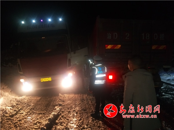 1月6日至8日鎮(zhèn)坪持續(xù)大到暴雪天氣,雞心嶺路段因海拔較高,積雪結冰嚴重,導致30余輛大型貨車滯留。鎮(zhèn)坪交警及時上山疏導交通,對發(fā)生緊急情況的車輛進行救援,并對未采取防滑措施的車輛進行勸返,截至1月8日上午11時交警仍然在該路段進行救援工作。(圖文/趙榮鵬)JxD安康新聞網(wǎng)