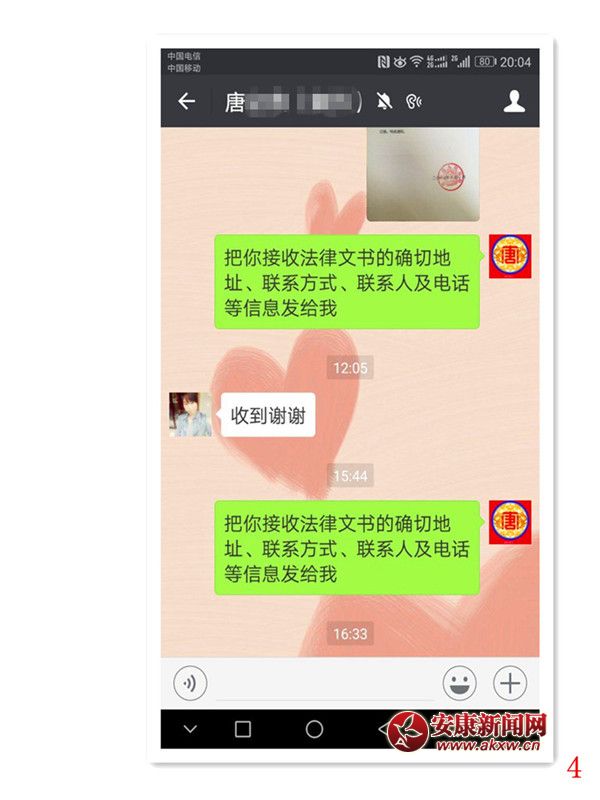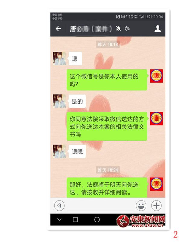 安康新聞網(wǎng)訊(通訊員 翁雪)微信送達(dá)訴訟文書,成為新形勢下加強人民法院與當(dāng)事人之間溝通交流、化解糾紛的一種快捷便利手段,大大節(jié)省了訴訟成本和時間,這是紫陽法院在訴訟文書送達(dá)方面靈活、務(wù)實、高效的又一探索。承辦法官只需手指輕點,即向案件當(dāng)事人發(fā)出“微信傳票”,不到十秒時間,對方立即回復(fù):“收到。”這就是紫陽法院第五審判團(tuán)隊向唐某與楊某離婚案件當(dāng)事人成功送達(dá)開庭傳票的情景。