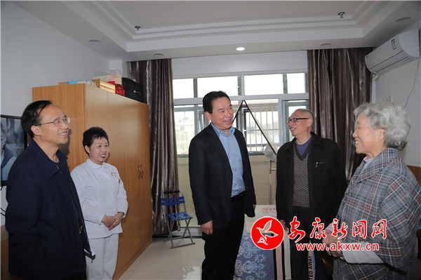 漢濱區(qū)陽光護理院,秋日和煦、窗明幾凈,五彩繽紛的小風車隨風輕動,一派安逸恬靜的幸福景象。趙俊民拉著老人們的手親切詢問:“老人家,身體好健旺。∽≡谶@里感覺怎么樣?”老人連聲稱道:“好哇,好哇!吃得好,住得好,環(huán)境好,還有一幫老伙伴,大家都很開心!”看到老人們紅光滿面、精神矍鑠,趙俊民對護理院的工作予以充分肯定,要求大家要做到愛心、細心、耐心,努力為老人們營造更好的生活環(huán)境。