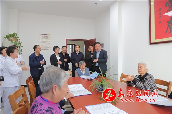 漢濱區(qū)老年公寓,老人們一邊曬著太陽,一邊做著健身游戲、吃著茶點,還有的在下棋聊天、讀書看報、繪畫練字。遠遠就能聽見文體活動室里傳出一陣陣此起彼伏的歌聲和舒心爽朗的笑聲,這是老人們正在自發(fā)排演合唱節(jié)目,時而伴著著琴聲引吭高歌,時而因為忘詞跑調開懷大笑。趙俊民詳細詢問了解老人的身體狀況和生活情況,對護理人員的辛勤付出給予肯定和鼓勵,并強調各級養(yǎng)老機構既要重視老人們的物質生活,更要重視老人們的精神需求,多組織開展一些豐富多彩的活動,讓他們老有所學、老有所為、老有所樂。