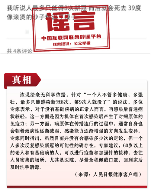 傳“偽科普”販賣焦慮引恐慌。5月以來,全國多地入夏,迎來炎熱高溫天氣,與季節(jié)關(guān)聯(lián)性較強(qiáng)的科普信息備受關(guān)注,“空調(diào)反復(fù)開關(guān)能省電”“夏天吃‘苦’勝似進(jìn)補(bǔ)”等誤區(qū)信息也隨之被炒作、散布。特別是近來新冠“二陽”病例增多,“新冠抗體半年保護(hù)期”“新冠病毒新型變異株”等信息在網(wǎng)上引發(fā)熱議,給民眾心里平添“忐忑”。于是,有人借機(jī)搭蹭熱點(diǎn),以“科普”之名捏造“一個(gè)人不管多健康,多強(qiáng)壯,最多只能感染新冠8次,第9次人就沒了……”等聳人聽聞的謠言,盡管有專家駁斥其“純屬無稽之談,毫無科學(xué)依據(jù)”,但仍在一定程度上激發(fā)了部分人群的恐慌情緒。
