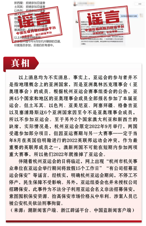 謠言6:八個國家宣布不參加杭州亞運(yùn)會?杭州因舉行亞運(yùn)會將于9月10日至25日放假?