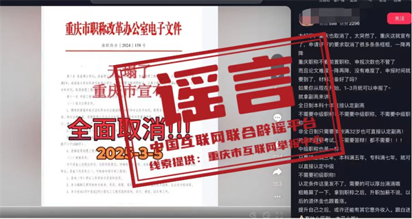 真相:近日,有網(wǎng)民在互聯(lián)網(wǎng)平臺發(fā)布消息稱“重慶市宣布,申請評審的要求取消了很多條條框框,職稱申請不看前置職稱,全日制本科十年直接認(rèn)定副高,不需要中級職稱”,引發(fā)關(guān)注。經(jīng)核實,網(wǎng)傳信息系謠言。職稱評審均需逐級晉升,取得上一級職稱并滿足相應(yīng)學(xué)歷資歷條件后方可晉升高一級職稱。目前重慶市除特殊人才、博士后等3個針對特定對象的職稱申報綠色通道外,正常申報通道均需逐級晉升。網(wǎng)傳文件是網(wǎng)民通過P圖軟件編輯而成,試圖吸引不明真相的群眾咨詢,借機推銷職稱代辦服務(wù),收取高額費用。目前,謠言線索已轉(zhuǎn)交公安機關(guān)進一步調(diào)查處置。(來源:“重慶辟謠”微信公眾號)