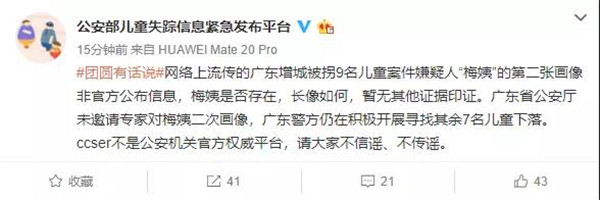網(wǎng)絡(luò)上流傳的廣東增城被拐9名兒童案件嫌疑人“梅姨”的第二張畫(huà)像非官方公布信息,梅姨是否存在,長(zhǎng)像如何,暫無(wú)其他證據(jù)印證。廣東省公安廳未邀請(qǐng)專(zhuān)家對(duì)梅姨二次畫(huà)像,廣東警方仍在積極開(kāi)展尋找其余7名兒童下落。ccser不是公安機(jī)關(guān)官方權(quán)威平臺(tái),請(qǐng)大家不信謠、不傳謠。