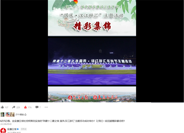 深化融合創(chuàng)新,全力打造高附加值文化創(chuàng)意產(chǎn)品。2022年第二十二屆中國安康漢江龍舟節(jié)期間,由安康日報社統(tǒng)籌承辦“國風(fēng)·漢江辭匯”主題公益演出活動,安康新聞網(wǎng)全力配合,落實晚會執(zhí)行、線上直播、采風(fēng)活動全程宣傳,“國風(fēng)·漢江辭匯”演出全網(wǎng)現(xiàn)場直播,點擊量達到100W+;顒舆引發(fā)全網(wǎng)多家媒體爭相報道。截至目前,包括人民日報、中央廣播電視總臺《藝術(shù)傳承》官網(wǎng)、今日頭條、北京在線、山東熱線等70余家中省市媒體單位陸續(xù)轉(zhuǎn)載報道。