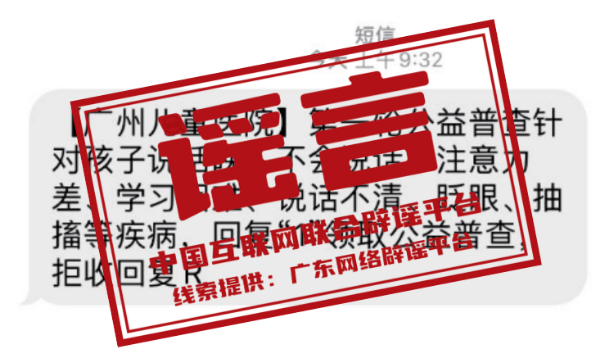 真相:近期,有社會醫(yī)療機構冒用廣州市婦女兒童醫(yī)療中心(以下簡稱“廣州婦兒中心”)名稱,通過群發(fā)短信的方式,宣傳該中心正在進行“身高普查”“針對孩子說話晚,不會說話、注意力差等”等公益普查項目。對此,廣州婦兒中心發(fā)布聲明稱,目前,該中心未就上述公益普查項目與其他任何醫(yī)療機構或社會組織存在合作關系,也未曾通過短信、電話向廣大患者推送過醫(yī)療信息。特此提醒廣大市民,切勿輕信此類信息,并注意保護個人隱私。(來源:廣東省互聯網舉報中心)