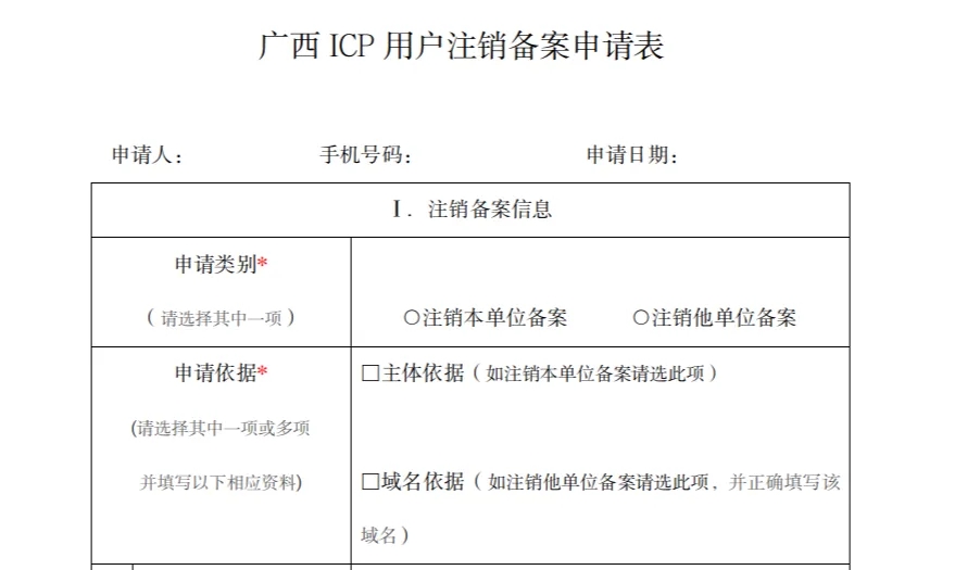 備案注銷需要到備案號當(dāng)?shù)氐耐ㄐ殴芾砭窒螺d“注銷備案申請表”,按“填表須知”中的要求把申請表里的信息填好,將材料郵寄或送到指定地點(diǎn)即可。處理結(jié)果申請人可自行登錄工信部備案系統(tǒng)“公共查詢”可查詢。以廣西為例: