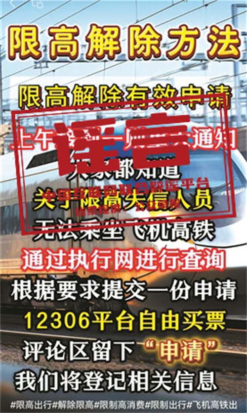 真相:近日,一些短視頻平臺(tái)頻現(xiàn)所謂“限高令新政”信息,宣稱“有內(nèi)部途徑,被限制高消費(fèi)人員不用還款也能正常買機(jī)票、高鐵票”,引發(fā)關(guān)注。對此,最高人民法院執(zhí)行局相關(guān)負(fù)責(zé)人表示,關(guān)于“新政”一說實(shí)屬謠言。各級(jí)人民法院從未出臺(tái)過解除限制消費(fèi)措施,或?yàn)椴粌斶債務(wù)的限高人員提供長期“解限”的相關(guān)規(guī)定。網(wǎng)上關(guān)于對不履行生效法律文書確定義務(wù)的被執(zhí)行人解除限制消費(fèi)措施等內(nèi)容均為不實(shí)信息。(來源:北京青年報(bào))