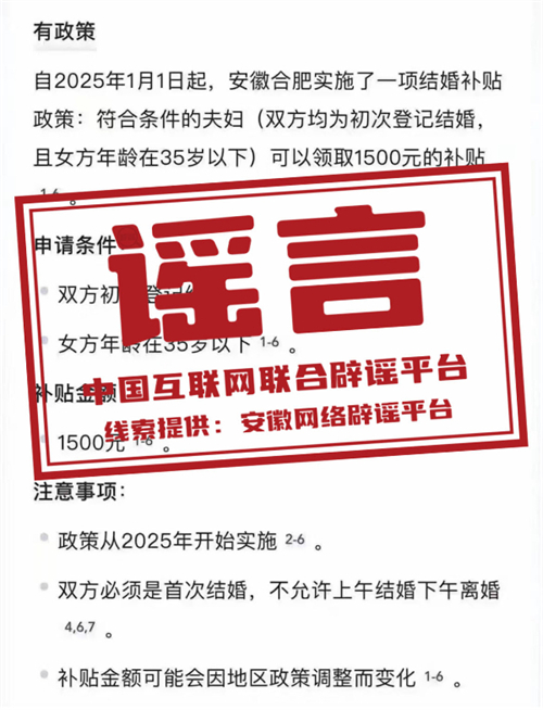 真相:近日,有網(wǎng)民發(fā)布消息稱“自2025年1月1日起,安徽合肥實(shí)施結(jié)婚補(bǔ)貼政策”“初次結(jié)婚登記可以領(lǐng)取1500元補(bǔ)貼”“下載相關(guān)APP即可領(lǐng)補(bǔ)貼款”,引發(fā)關(guān)注。對此,合肥市民政局發(fā)布聲明稱,網(wǎng)傳消息為謠言。合肥市并未研究、出臺(tái)有關(guān)結(jié)婚登記的補(bǔ)貼政策,望廣大網(wǎng)民注意甄別。(來源:“安徽省互聯(lián)網(wǎng)違法和不良信息舉報(bào)”微信公眾號(hào))