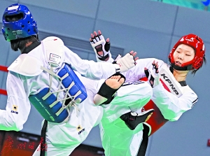 張夢宇(右)在跆拳道女子67公斤級為廣東代表團(tuán)再添一金。新華社記者 郭晨 攝