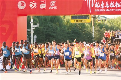 上周日7時(shí)30分,迎著金秋北京溫暖的陽光,3萬名跑步愛好者在北京馬拉松賽(下稱北馬)的起點(diǎn)線——天安門前高唱完國歌后出發(fā),跑向終點(diǎn)奧林匹克廣場。最終,來自摩洛哥的小伙博納思爾以2小時(shí)11分18秒的成績奪得男子組冠軍,埃塞俄比亞的貝耶內(nèi)以2小時(shí)27分44秒的成績摘得女子組冠軍。