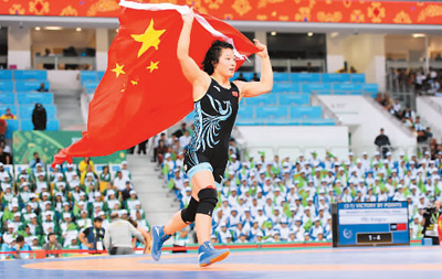 9月25日,在第五屆室內(nèi)與武道運(yùn)動(dòng)會(huì)自由式摔跤女子58公斤級(jí)比賽中,中國選手裴星茹以3比1戰(zhàn)勝吉爾吉斯斯坦選手德內(nèi)別科娃,獲得金牌。圖為裴星茹身披國旗慶祝勝利。HPD安康新聞網(wǎng)