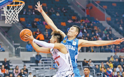 1月23日,青島隊(duì)球員蘇偉(后)在比賽中封蓋對(duì)手上籃。當(dāng)日,在2017—2018賽季中國(guó)男子籃球職業(yè)聯(lián)賽(CBA)第三十輪比賽中,廣東隊(duì)主場(chǎng)以119∶104戰(zhàn)勝青島隊(duì)。當(dāng)日其他比賽結(jié)果為:新疆125∶108同曦,山東126∶100四川,江蘇110∶92八一,北京108∶92吉林。X7X安康新聞網(wǎng)