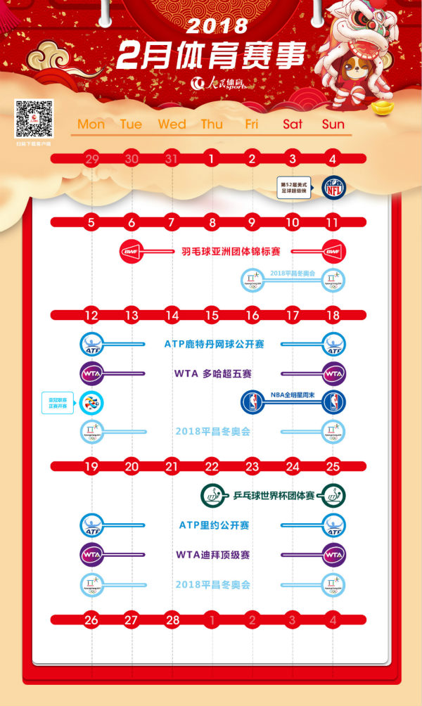 2月恰逢中國新春佳節(jié),在這辭舊迎新的月份中,體壇也大賽不斷。四年一屆的冬奧會(huì),中國冰雪健兒是否會(huì)有新的突破,人民體育記者將親赴現(xiàn)場(chǎng),為您報(bào)道;乒乓球世界杯團(tuán)體賽是乒壇開年的首個(gè)大賽。2017下半年經(jīng)歷小低谷的中國男乒急需為自己正名,面對(duì)擁有波爾、奧恰洛夫的德國隊(duì),以及進(jìn)步明顯的日本隊(duì),他們能否一一擊敗收獲8連冠,我們拭目以待。除此之外,NBA全明星周末對(duì)每個(gè)籃球迷都是大節(jié)日,看籃球巨星如何玩轉(zhuǎn)比賽;亞冠聯(lián)賽也將在本月開賽,中國球隊(duì)的表現(xiàn)令人期待。春節(jié)長假,闔家歡聚,邊看比賽邊過大年,這體驗(yàn)一定不錯(cuò),收藏我們的賽歷,精彩賽事,一覽無遺。
