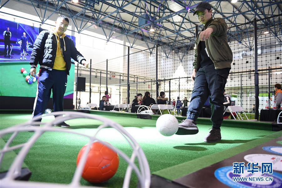 兩位參觀者在體驗(yàn)臺(tái)式足球。 新華社記者鞠煥宗攝