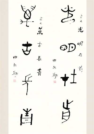 字如其人,古來(lái)一直有此一說(shuō),我每每觀之,總會(huì)想起元代馬致遠(yuǎn)的散曲“枯藤老樹昏鴉,古道西風(fēng)瘦馬”那樣的寫意。后期他突然對(duì)金文有了興趣,自己琢磨著寫起了金文。金文是繼甲骨文之后發(fā)展到第二階段的中國(guó)文字,是刻在銅器、鐘鼎上的,也屬于象形文字,時(shí)間上處于篆字和隸書之前。我開始不明白老師怎么轉(zhuǎn)型寫起這種字來(lái)了,也許是愛(ài)好、是喜歡吧,也許是一種永不渴止的新的追求,但這兩種字給人的美感享受,卻是懂與不懂書法的人都一致認(rèn)可的。