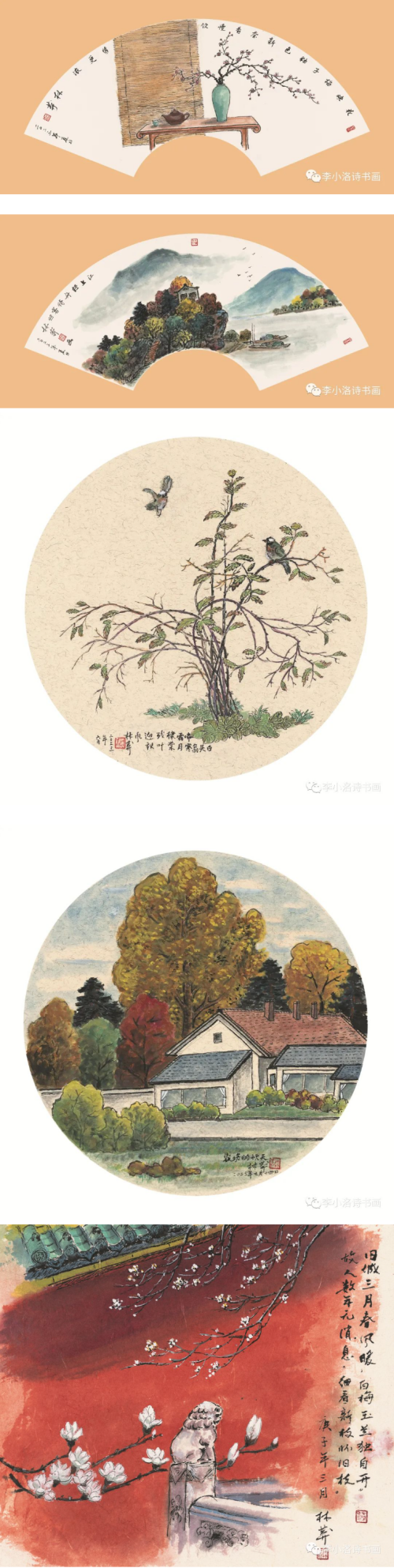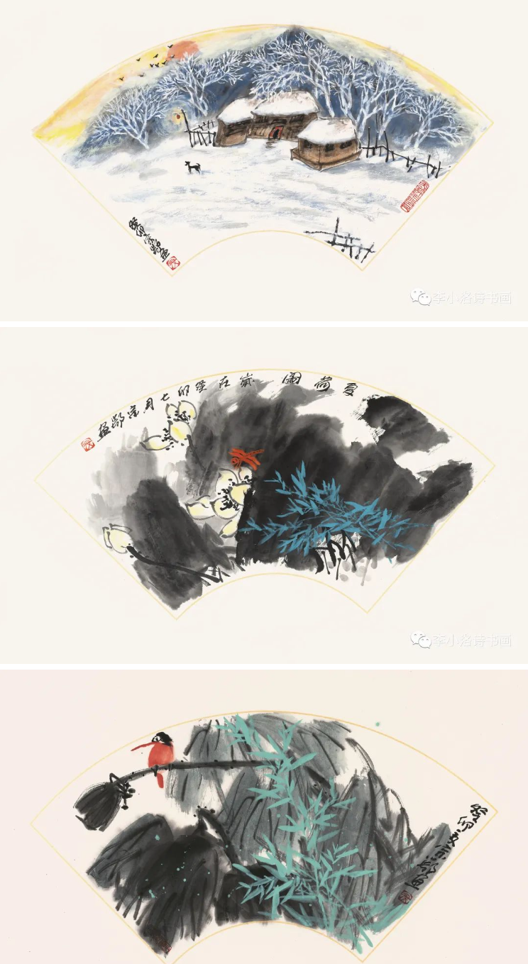 詩人寇宗鄂和林莽,均為《詩刊》編委,都曾擔(dān)任過《詩刊》的編輯部主任?茏诙踉鴰煆闹剿嫾倚毂蓖,詩人牛漢,詩畫兼擅。林莽作為白洋淀詩群和朦朧詩重要代表詩人,詩畫相融,桃李天下。張瑞田早年寫詩,后來多寫散文和書畫評論,是當(dāng)今活躍的評論家和書家。李木馬,李小洛,都曾參加過《詩刊》社的“青春詩會”,就讀魯迅文學(xué)院高研班,在詩歌和書畫創(chuàng)作上多年努力,取得了一定的成績……一人一格、一人一品,一扇一意、一扇一味,五位詩人作家的詩意筆墨,傳遞著各自對生活、藝術(shù)與世界的熱愛,認(rèn)知與發(fā)現(xiàn)。君子和而不同,透過一幀幀詩意盎然的扇面小品,在交相輝映的筆情墨趣中,可以看到他們相互啟迪,感染和照亮的友誼與藝術(shù)追求。