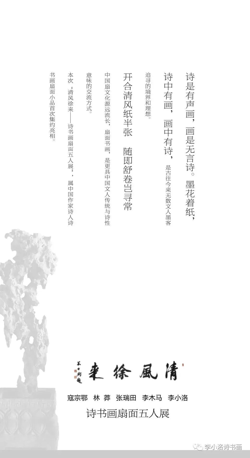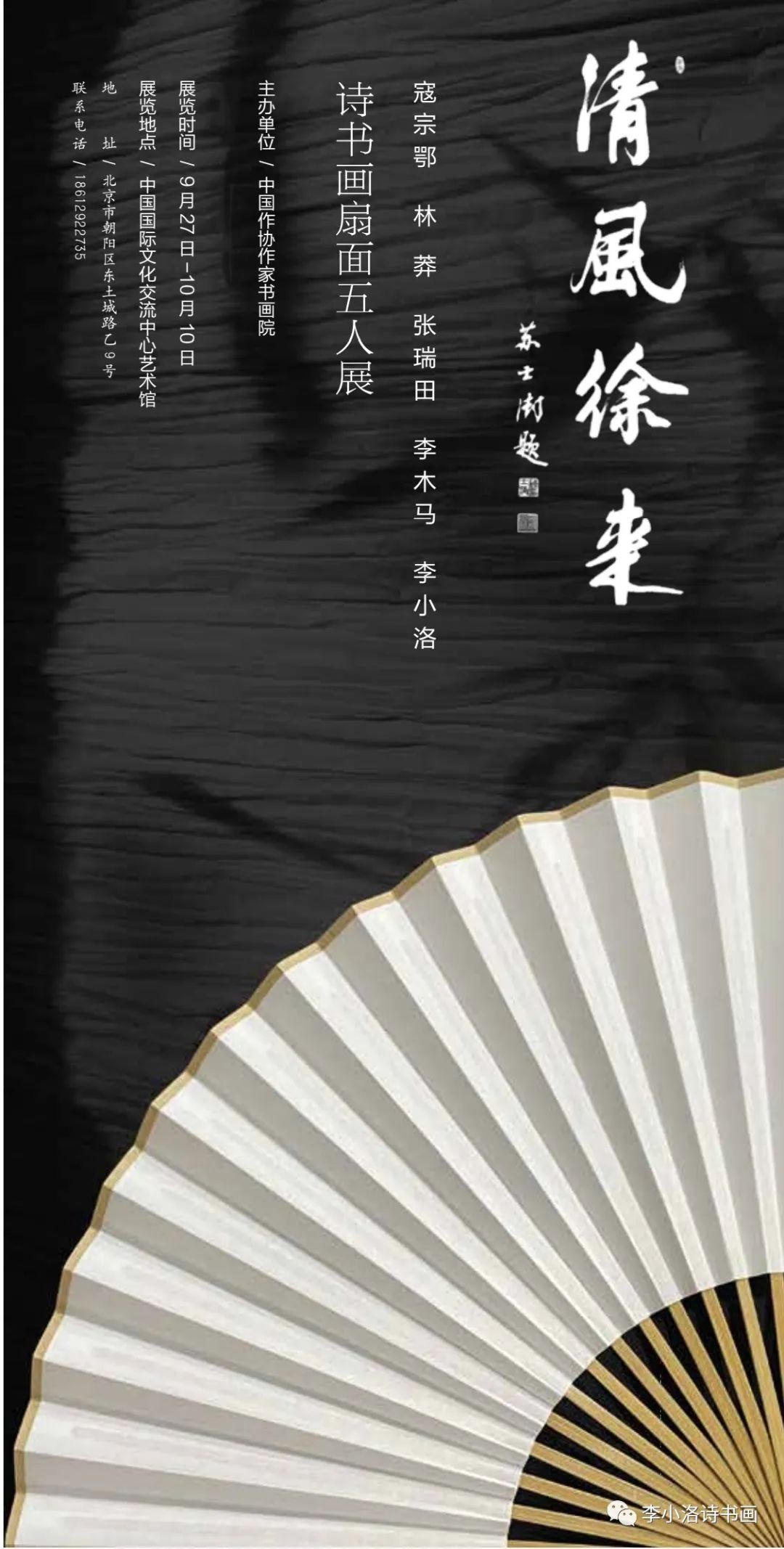 詩是有聲畫,畫是無言詩。墨花著紙,詩中有畫,畫中有詩,是古往今來無數(shù)文人墨客追尋的境界和理想。中國扇文化源遠(yuǎn)流長,扇面書畫,是更具中國文人傳統(tǒng)與詩性意味的交流方式。本次“清風(fēng)徐來——詩書畫扇面五人展”,屬中國作家詩人詩書畫扇面小品首次集約亮相。